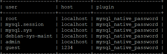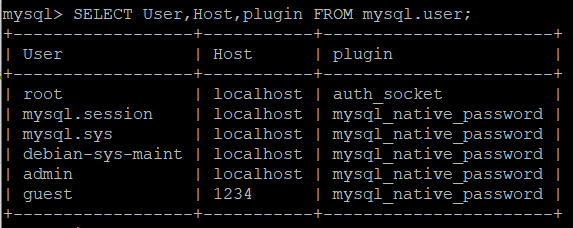 mysql> SELECT User, Host, plugin FROM mysql.user;