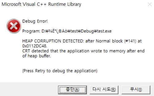 배열의 크기를 벗어난 상태에서 작업을 해서 HEAP CORRUPTION 오류도 뜨고