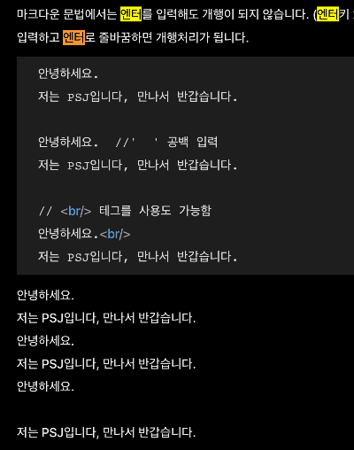 예로 들자면,, 원래는 줄바꿈이 공백 2글자(space 2번) 혹은 HTML 태그인 <br>을 사용하는데요.