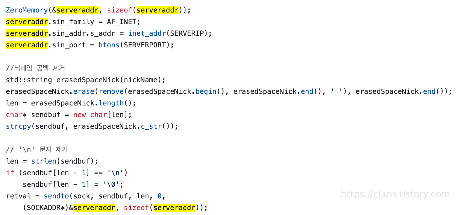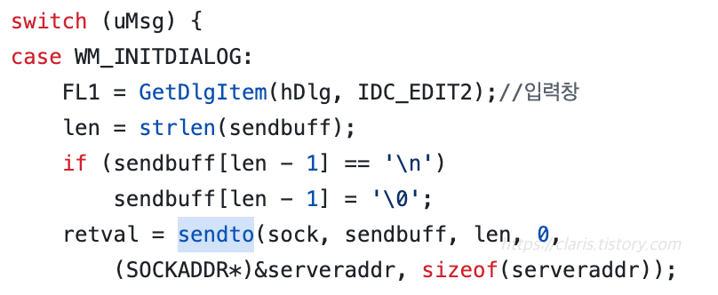 그다음, 클라이언트 측에서는 이 정보를 활용해서 sendto()가 호출될 때마다 인자로 같이 넣어주는 형태입니다.