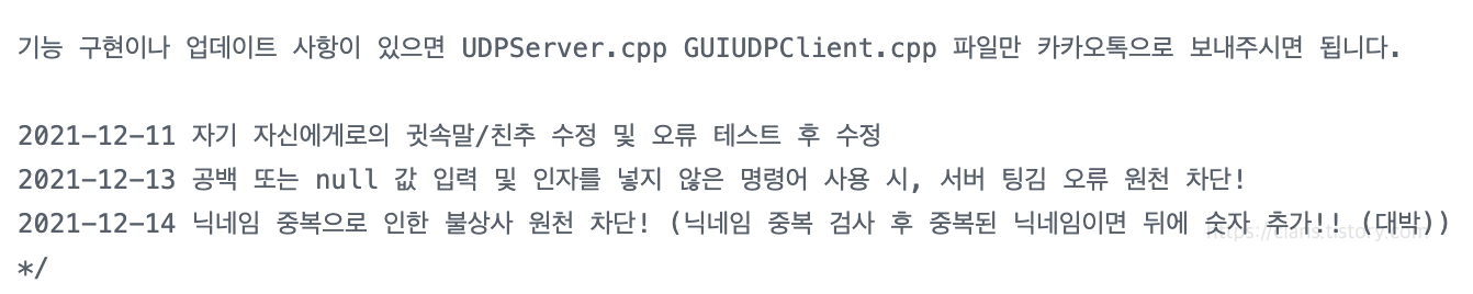 사실 다른 조들 죄다 TCP로 프로젝트하길래 좀 힙해 보이고 싶어서 UDP로 채팅 만들었는데 3년 뒤에 다시 들춰보니 그땐 신경도 쓰지 못했던 부분들을 좀 더 알게 되고 UDP의 비연결 지향 특성을 유지하면서도 적당한 명분이 생겨서 완전 럭키매드잖아 🍀