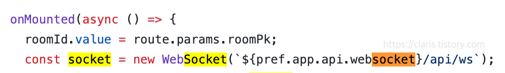 자, 그동안 low한 레벨의 소켓을 왜 주저리 주저리 했느냐. 저 번거로운 작업을 추상화하고 쉽게 웹에서 사용할 수 있도록 한 것이 웹소켓이거든요. 상단에 첨부한 코드 이미지는 첫 번째 프로젝트에서 웹소켓을 연결할 때 작성한 코드입니다. 유저가 채팅방에 들어가면-? 페이지가 마운트 될 때 웹소켓에 연결하는 형태였습니다.