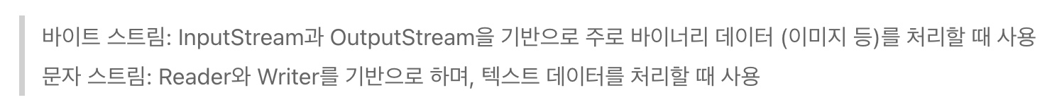 Java I/O 스트림은 데이터의 연속적인 흐름을 의미하며, 파일, 네트워크 소켓, 메모리 등에서 데이터를 바이트나 문자 단위로 읽고 쓰는 기능을 제공합니다. 여기서 바이트 스트림과 문자 스트림으로 나뉘죠.