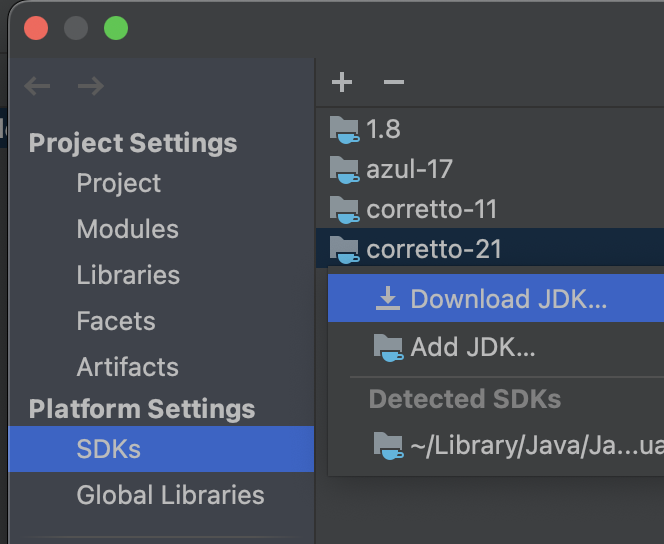 Platform Settings -> SDKs -> (+ 버튼) -> Download JDK를 통해 원하는 버전의 JDK를 다운로드합니다.