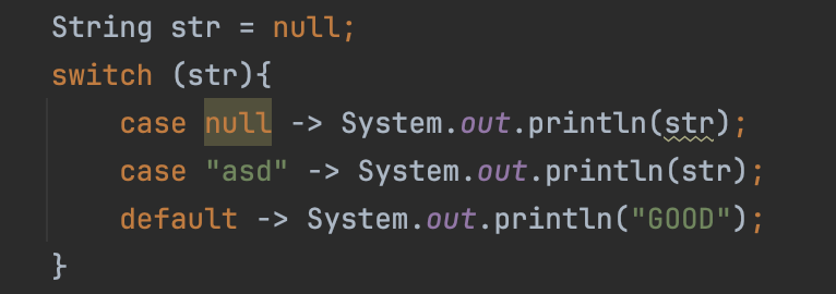 그래서 기존에는 switch문 밖에서 null 체크를 하며, switch문을 작성했습니다. 하지만 이제는 다르다! 자바 버전이 올라가면서 case문에서 람다식도 쓸 수 있게 되었고 바뀐 부분이 많긴 하지만, 21부터는 case문에 null을 쓸 수 있게 되었습니다.