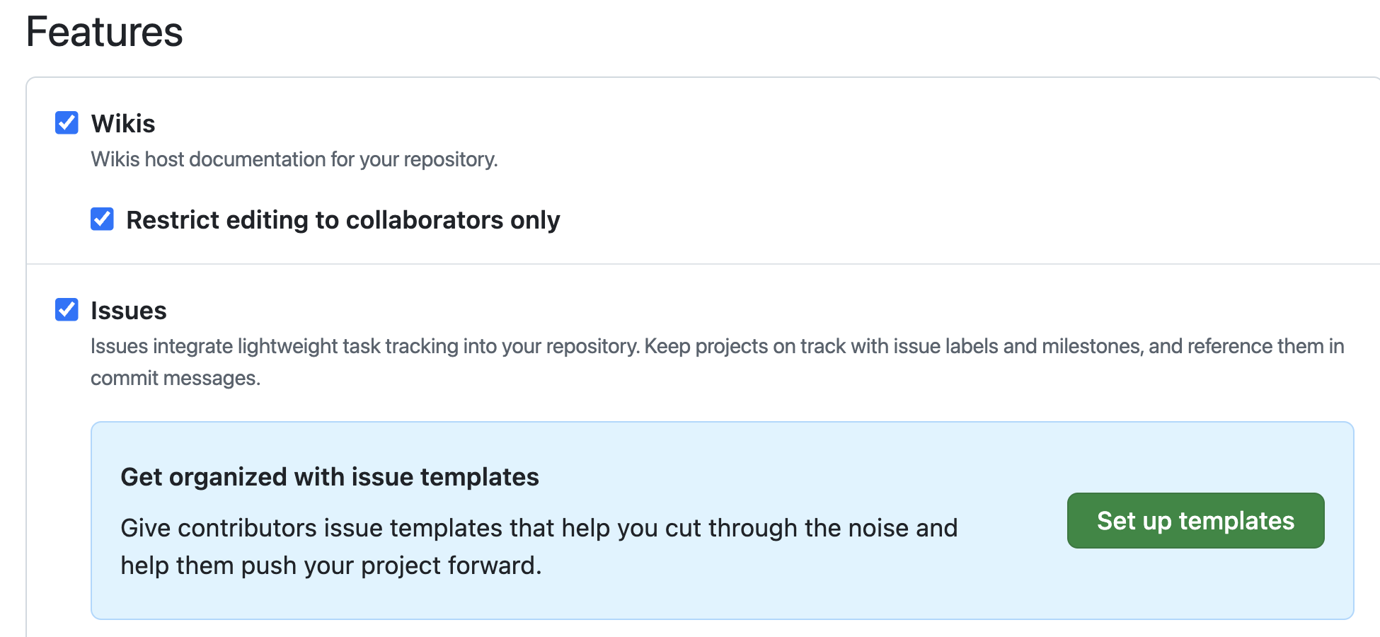 그 후, 스크롤을 내려서 Features 메뉴에 있는 Set up templates 버튼을 누릅니다.