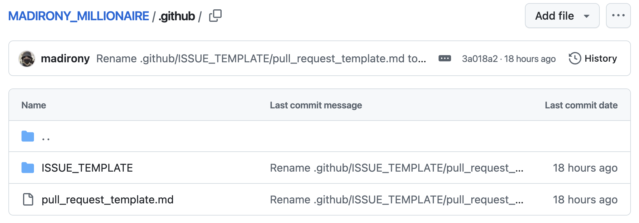 Issue Template을 만들었으니 이어서 PR Template을 만들어봅시다. Repository에서 .github 폴더로 들어갑니다. 유의할 점은 이슈 템플릿을 만들면 .github/ISSUE_TEMPLATE 폴더로 이동하게 되는데 PR Template은 .github 폴더 아래에 있어야 적용됩니다.