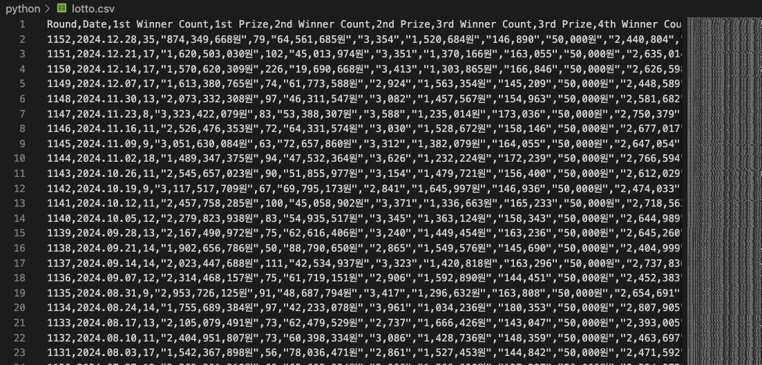 동행 복권 홈페이지에 들어가면 여태까지의 당첨번호 데이터를 엑셀 혹은 html 형태로 다운로드할 수 있습니다. 아주 오래전 로또는 1게임 당 2000원할 때도 있어서 601회차부터 확인해 보도록 하겠습니다. 사실 홈페이지에서도 600회차 단위로 데이터를 끊습니다. 그래도 약 10년 치의 데이터니 충분하다고 봅니다. 원래 제 주력 언어는 Java이긴 하지만 데이터 시각화와 분석 쪽은 Python이 맛있어서 오랜만에 써봤습니다.