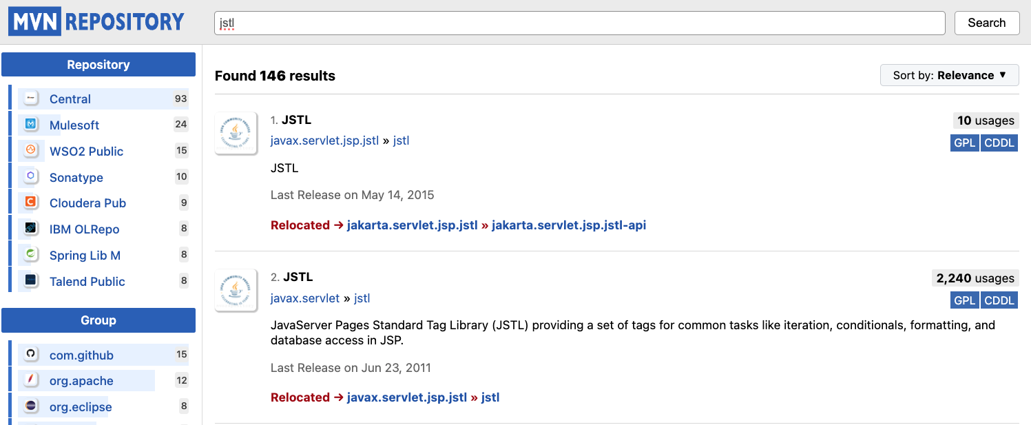 라이브러리는 mvn repository에서 검색을 통해 Usages가 많은 버전 위주로, 의존성을 Copy & Paste 하면 됩니다.